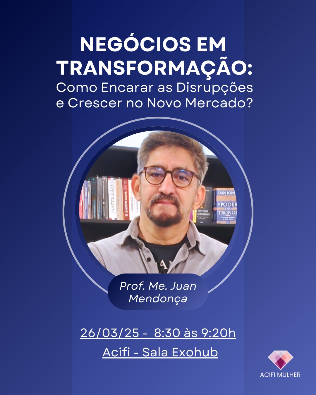 Acifi R. Padre Montoya, 490, Foz do IguaçuComo gerar insights para definir uma estratégia de inovação e competitividade, considerando as transformações disruptivas no mercado? Palestra Proferida pelo prof. Me. Juan Mendonça direcionado às empresárias, Contacto: 45- 999841237 Mestre em Gestão pela Unioeste Especialista em Tendencias de Mercado MBA em Liderança – EUA Consultor de Negócios da ACIFI É professor Associado pelo ITAI